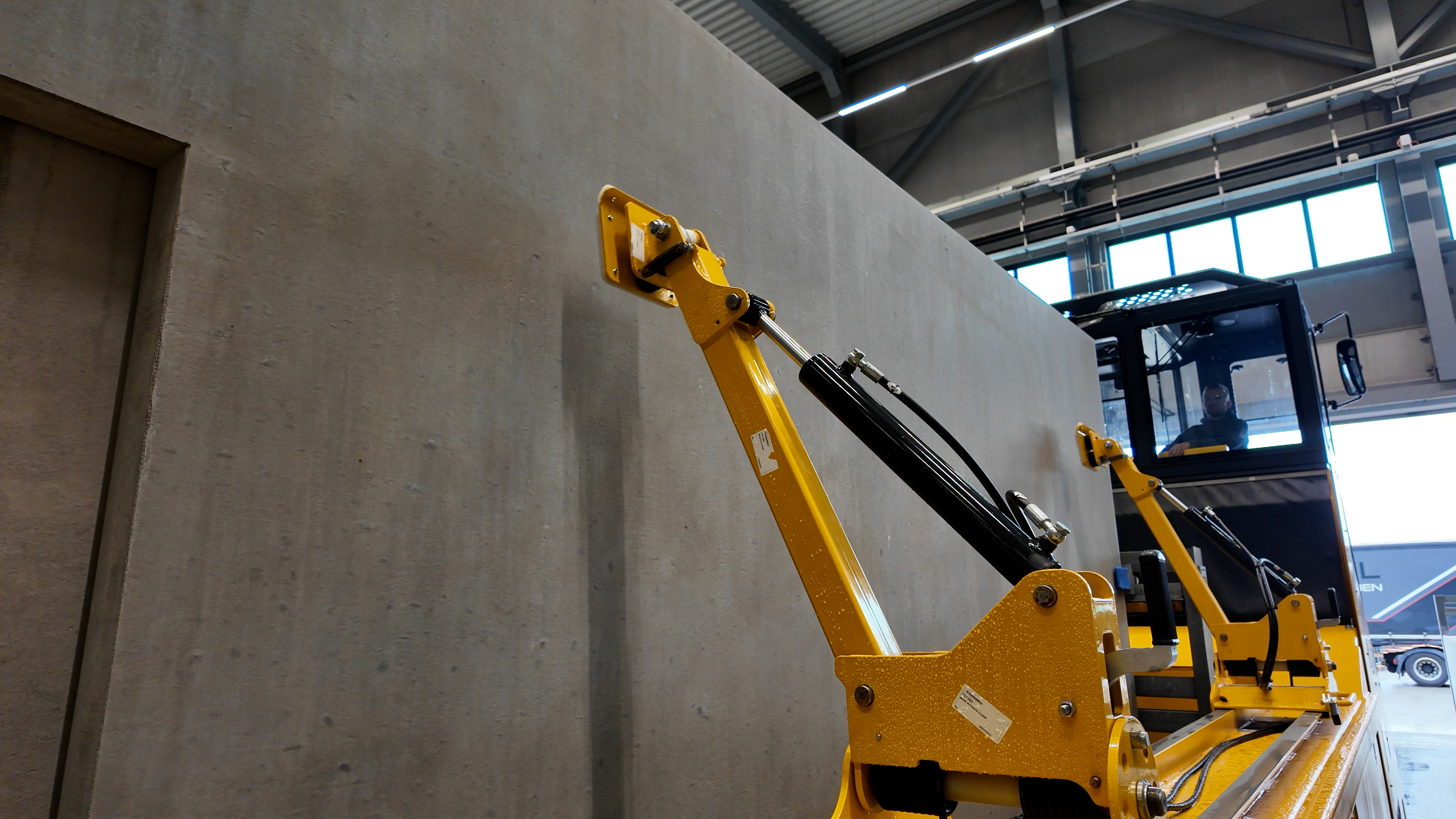 For handling precast concrete wall panels, the inloader transporter system proved to be the most efficient solution. In this context, Italcarrelli’s PTN 300S demonstrated its full versatility, ensuring maximum operational flexibility even in complex production and yard environments. 90-degree steering and high driving precision enable fast, safe maneuvering in confined areas, while the rapid hydraulic lifting system and elevated cab ensure optimal visual control throughout every phase of operation.